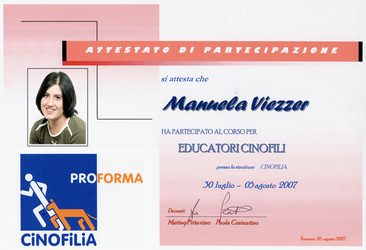 Dal 30/07 al 05/08/2007- Corso per Educatori Cinofili che si svolge in 7 giorni (56 ore) consecutivi di lavoro teorico - pratico. Le materie trattate sono relative allo studio del comportamento del cane e della sua gestione in ambito familiare e civico. Basato sulle teorie di apprendimento animale e sulla loro applicazione in addestramento, comprende anche nozioni di zootecnica, veterinaria, marketing e regolamentazione della cinofilia ufficiale.